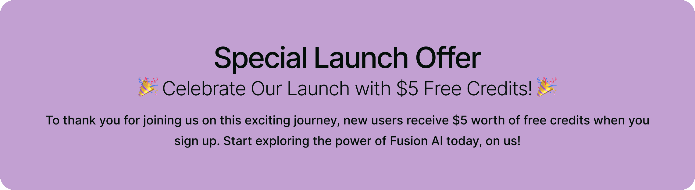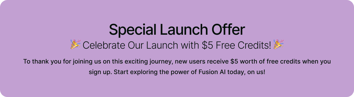 Unlock the power of Fusion AI with our simple credit system and take advantage of our $5 free credits offer.